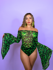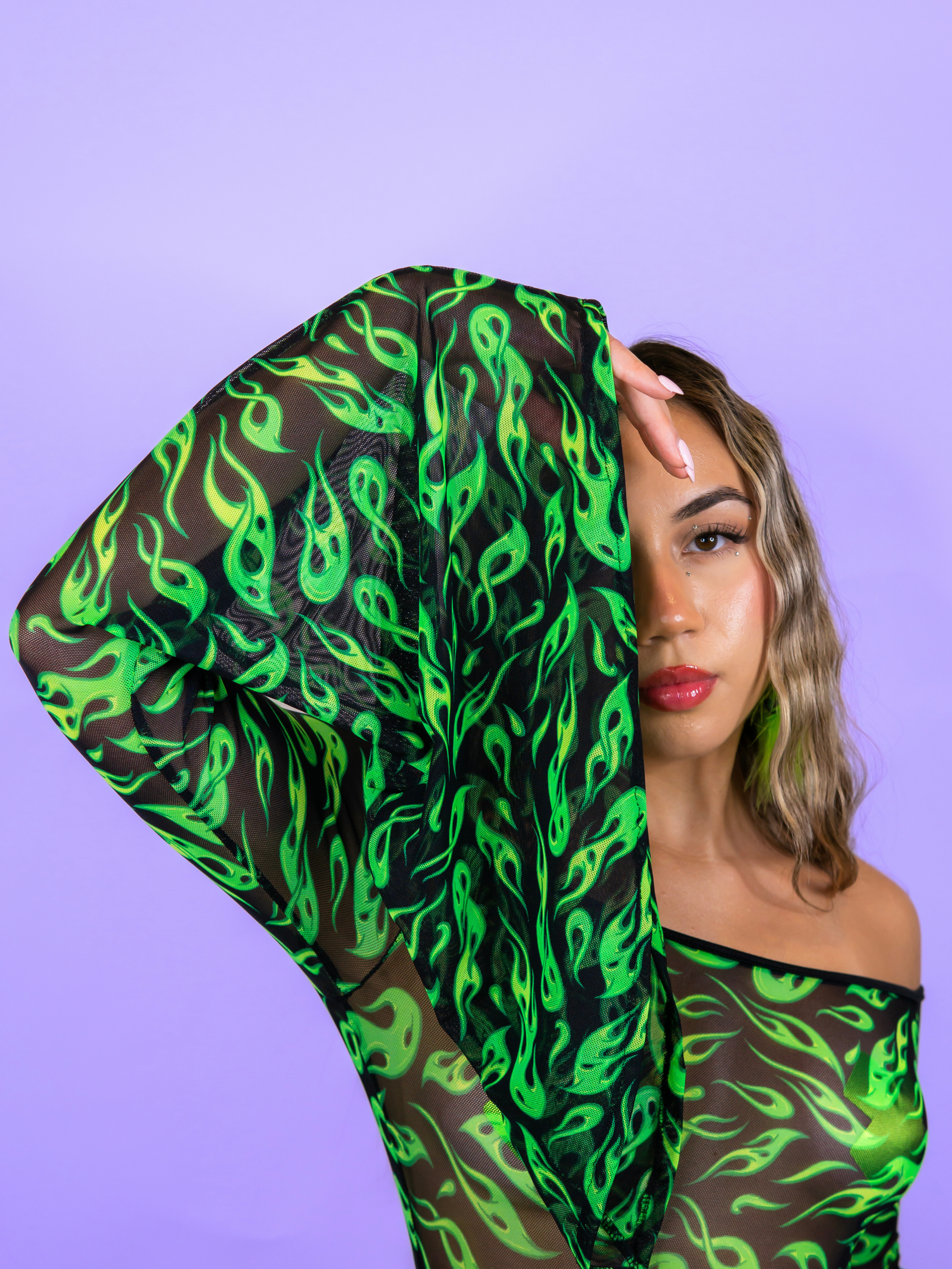 Unleash your inner extraterrestrial in our ALIEN FLAME BODYSUIT! This fierce mesh bodysuit features a bold lime flame design and playful bell sleeves, perfect for turning heads on the dance floor. Embrace the ultimate rave vibe and let your confidence blaze like never before!