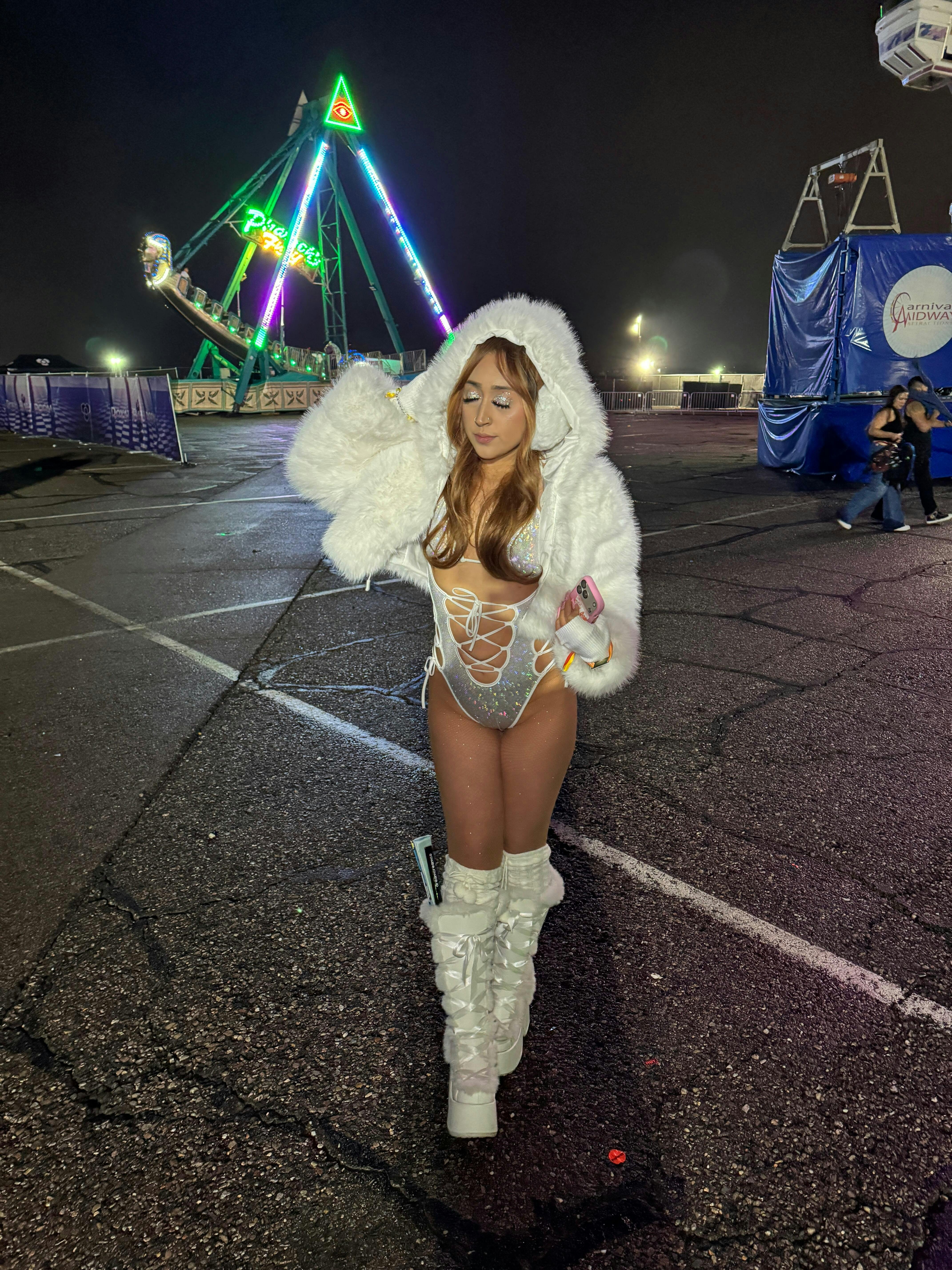 Step into your ice-queen era with the Glacier Angel Corsella Bodysuit. Our signature lace up Corsella in pure white sparkly dream is designed to make you look heavenly dangerous. With shimmer that catches every strobe and white fishnet arm sleeves that sculpt you into a frozen fantasy, this fit is all about divine confidence. Soft stretch fabric hugs your curves, while the frosted glow ensures all eyes stay on you. Serve angel energy with a savage edge!