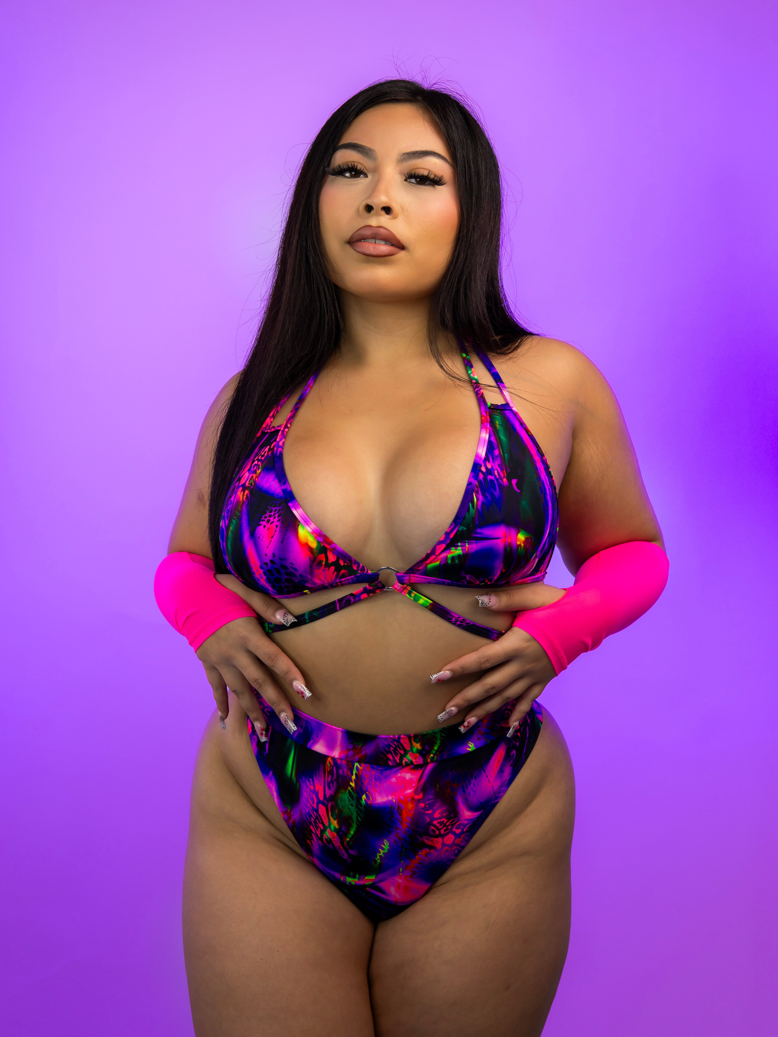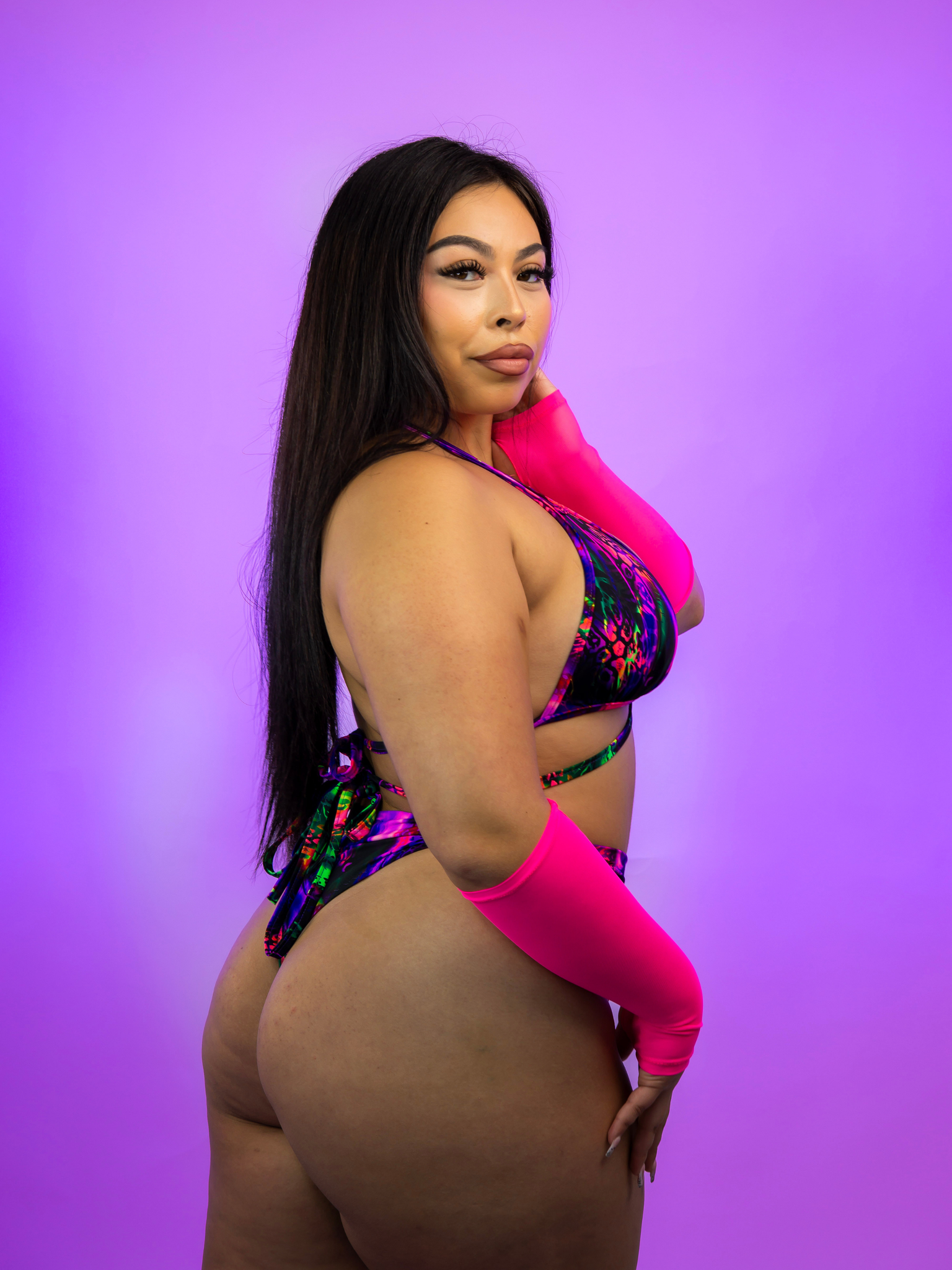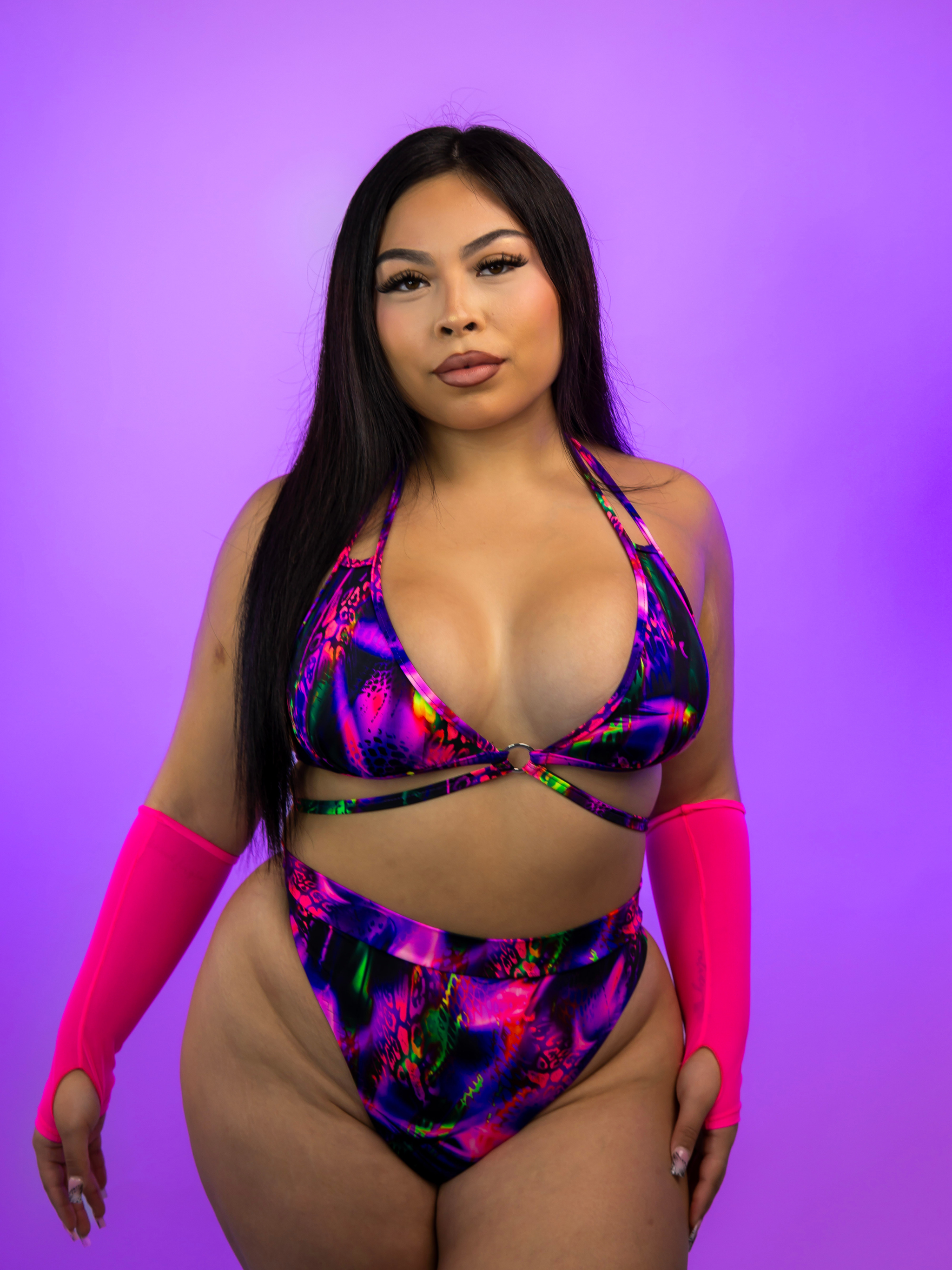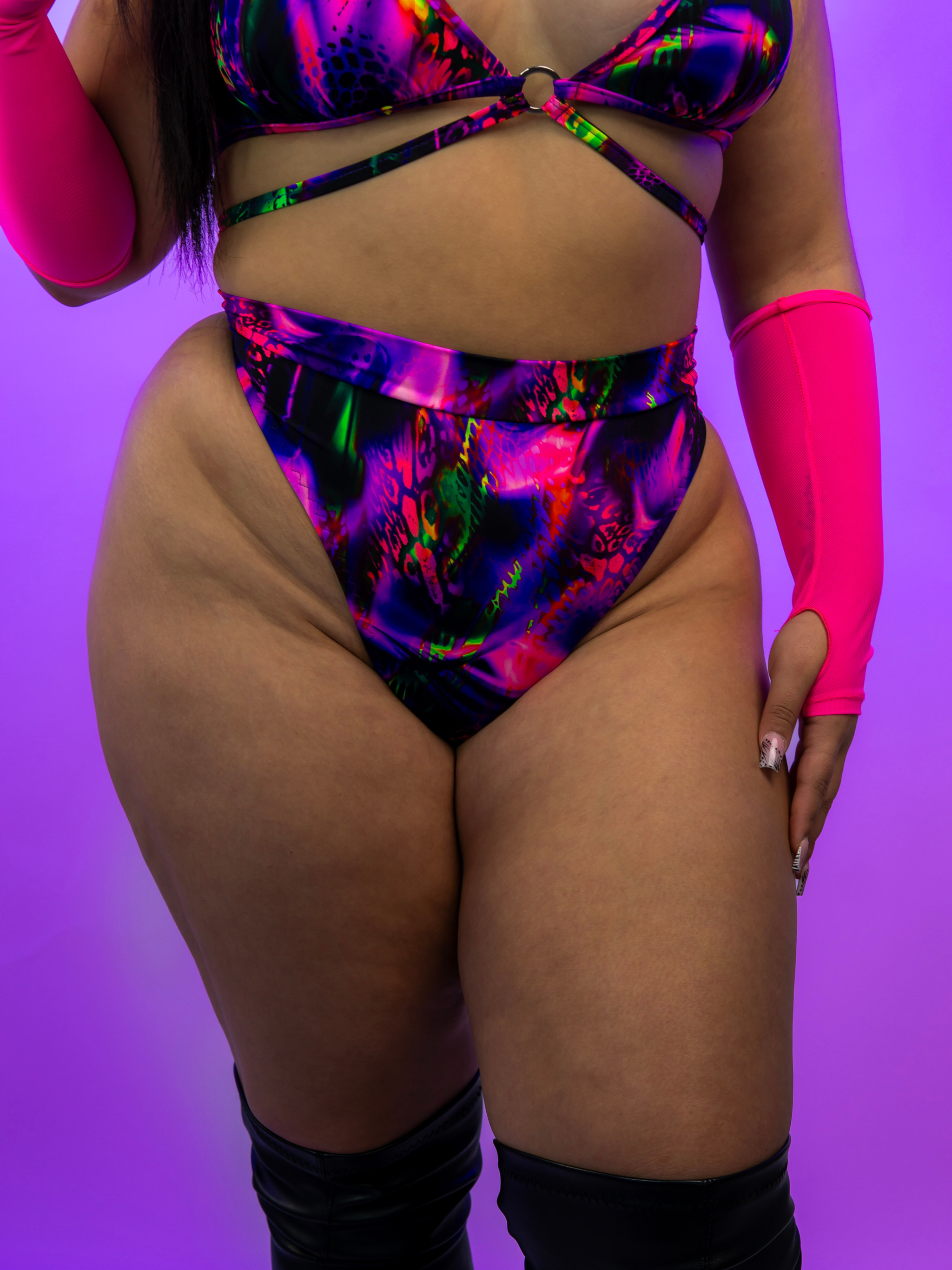 Make a statement from every angle with our SKYLIGHT Scrunch Back Thong Bottoms. Designed to accentuate your curves, these bottoms feature a captivating blend of purples and animal prints that shimmer under blacklight. With their scrunch back detail, they ensure you leave a lasting impression wherever you go, shining bright like the northern lights.