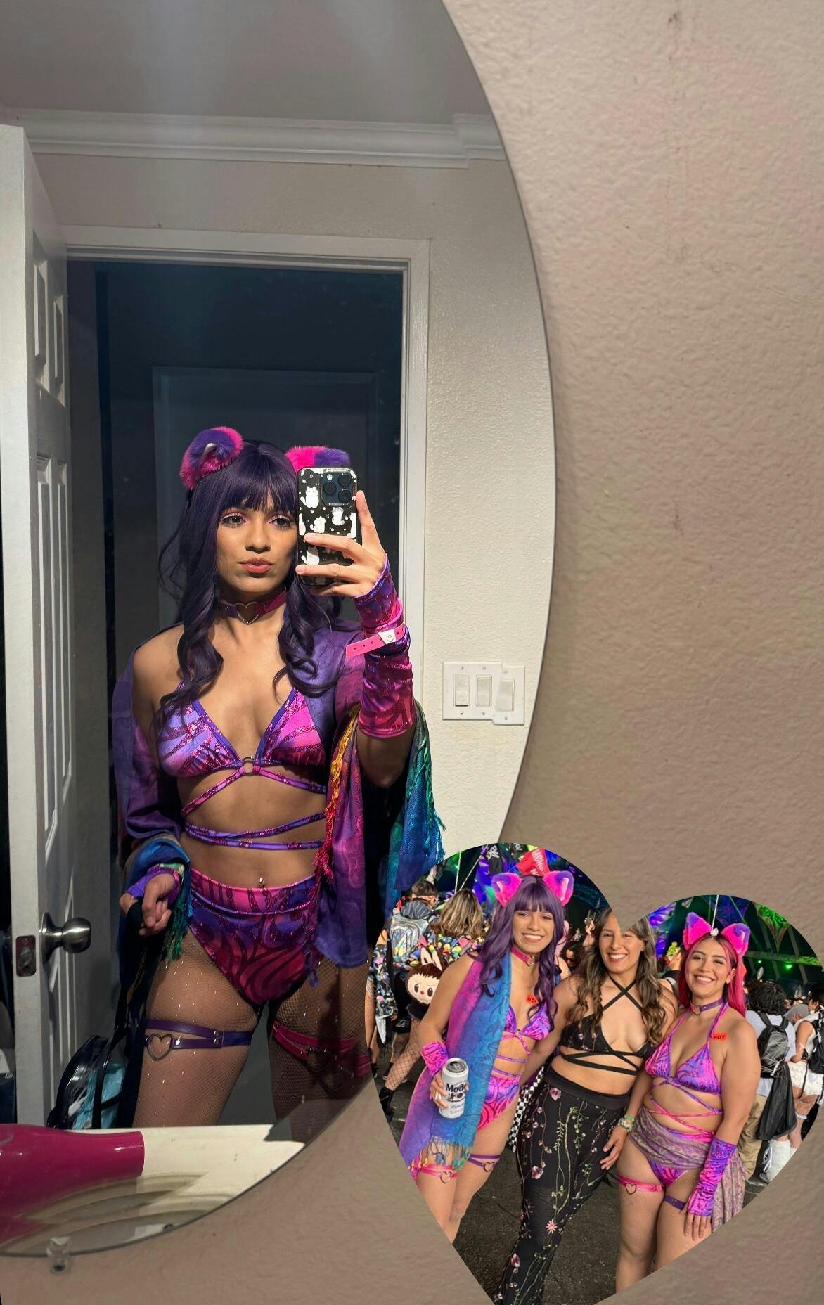 Where playful meets posh in a swirl of mesmerizing purple-pink hues! This stunning ensemble features a tantalizing triangle top paired with matching thong bottoms, ensuring you'll be turning heads wherever you go. Crafted from a luxurious fabric blend, it's as comfortable as it is captivating. Get ready to embrace your inner allure with a touch of cheeky charm!